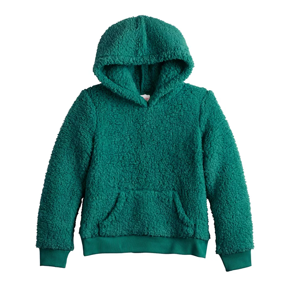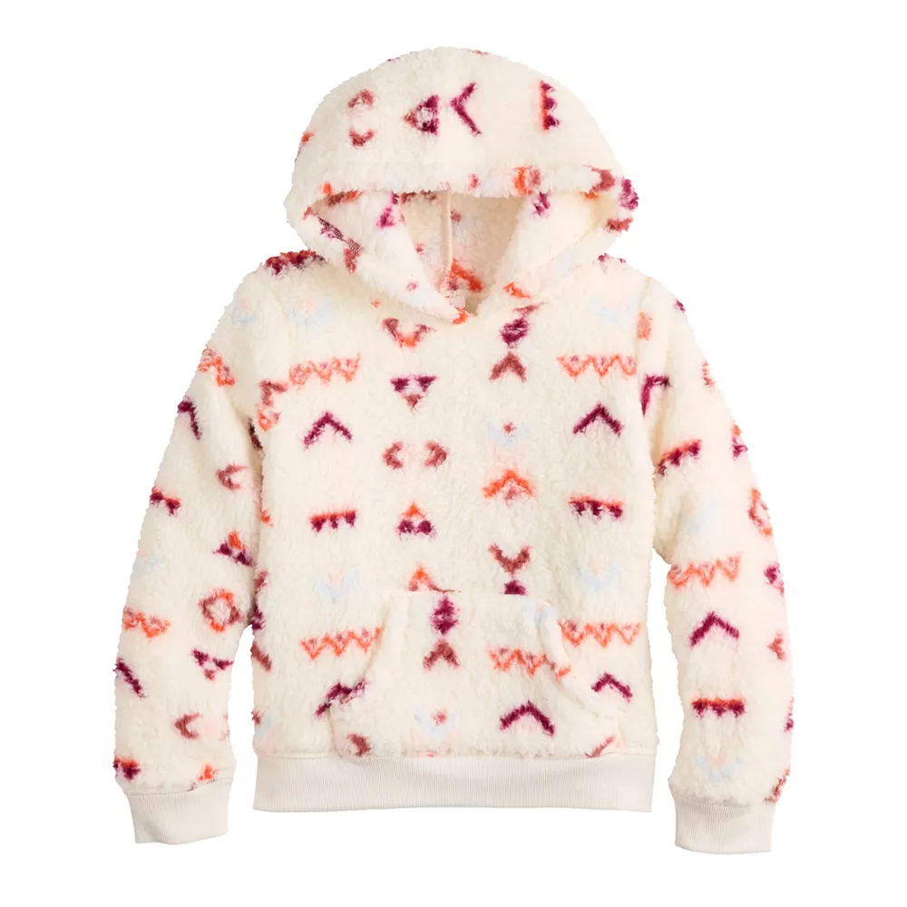 She’ll be comfy, cozy, and on trend in this girls’ fluffy sherpa pullover hoodie from Jumping Beans.